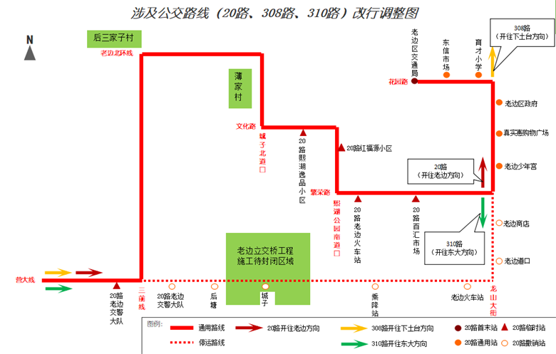 途徑封閉路段參照20路改行路線執(zhí)行,自龍山大街與繁榮路交匯處向北至下土臺歸到原線路運(yùn)營。
